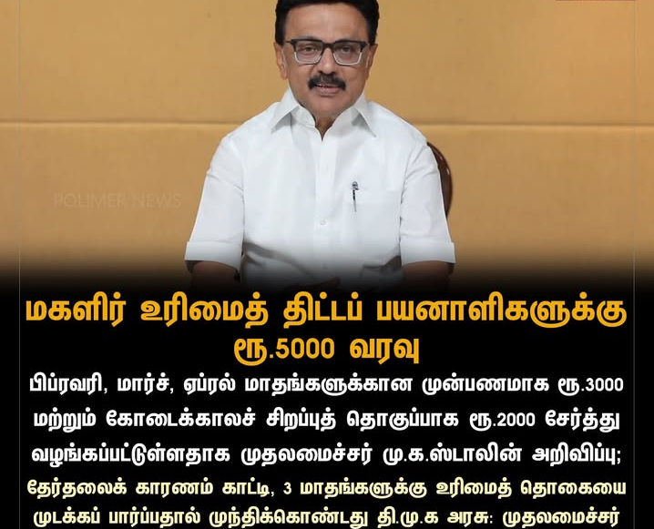 அனைத்து மகளிருக்கும் ருபாய்1000 வழங்கப்படும் என்று சென்ற திமுக தேர்தல் அறிக்கையில் இருந்தது, அதன் பின் தகுதியுள்ள மகளிருக்கு ரு1000 என மாற்றப்பட்டு பணம் வங்கி கணக்கில் பயனாளருக்கு அனுப்பிவந்தனர். தற்போது இன்ப அதிர்ச்சியாக ரு5000 தகுதியுள்ள மகளிருக்கு திமுக திராவிட மாடல் ஆட்சி அனுப்பி வைத்துள்ளது.
