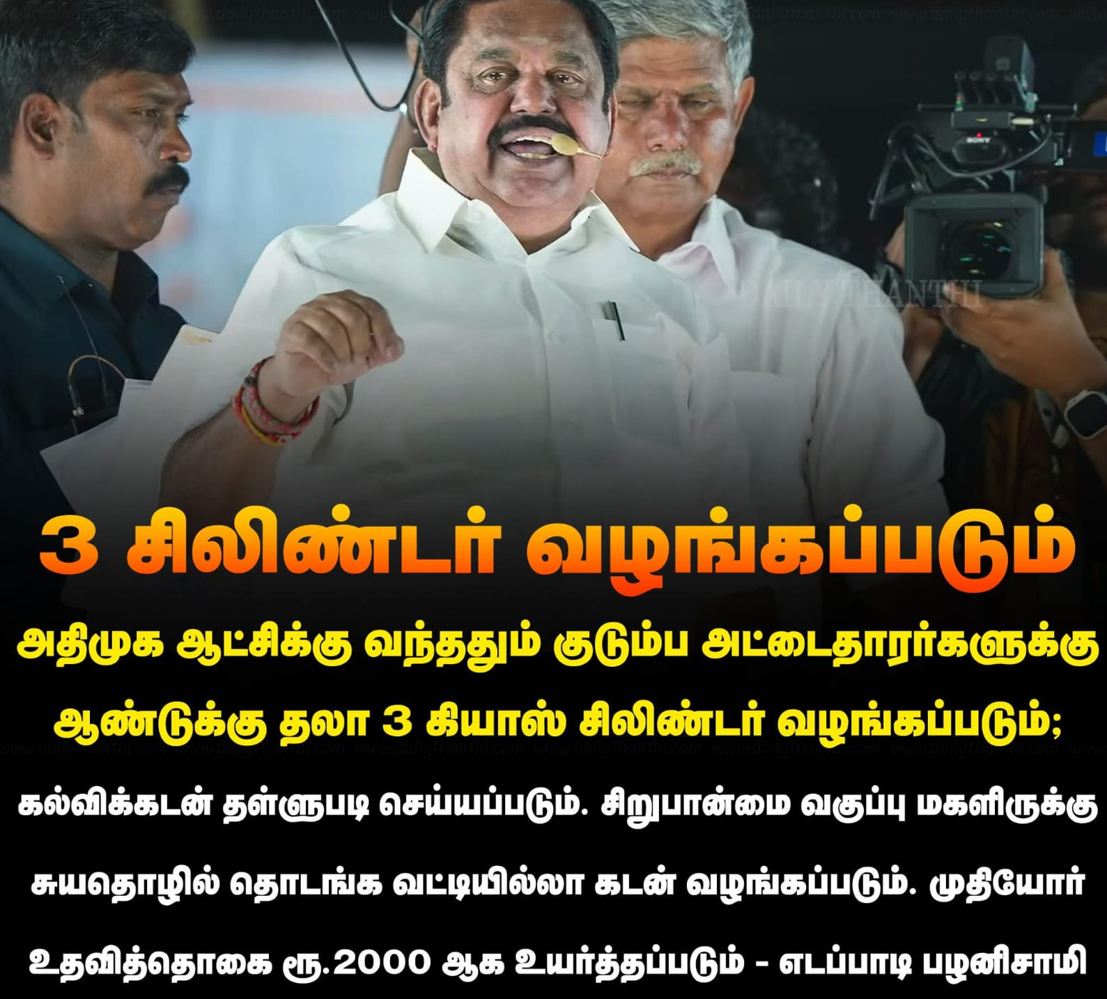 எடப்பாடி தான் அடுத்த ஆட்சி அமைத்தால் வீட்டிற்கு வருடத்திற்கு மூன்று சமையல் எரிவாயு சிலிண்டர் தருவதாக வாக்குறுதி அளித்து தமிழகம் முழுவதும் பேசு பொருளாகி உள்ளது.