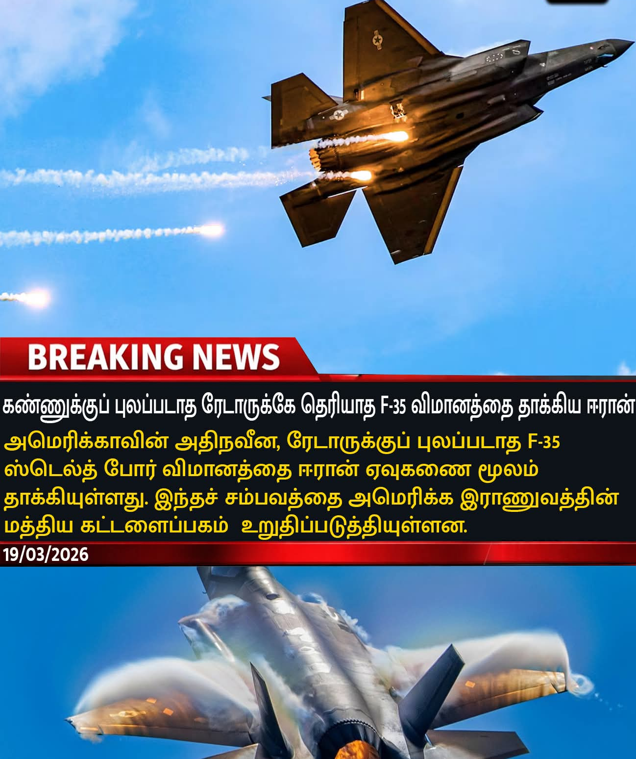 அமெரிக்காவின் அதிநவீன F35 போர் விமானத்தினை ஈரான் தாக்கியுள்ளது. இதன் மதிப்பு 850 கோடி ஆகும்.